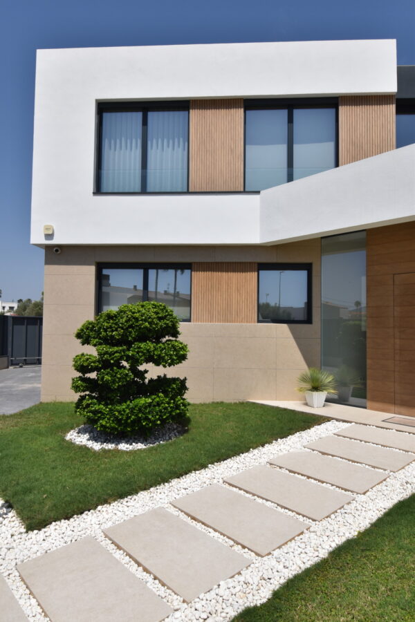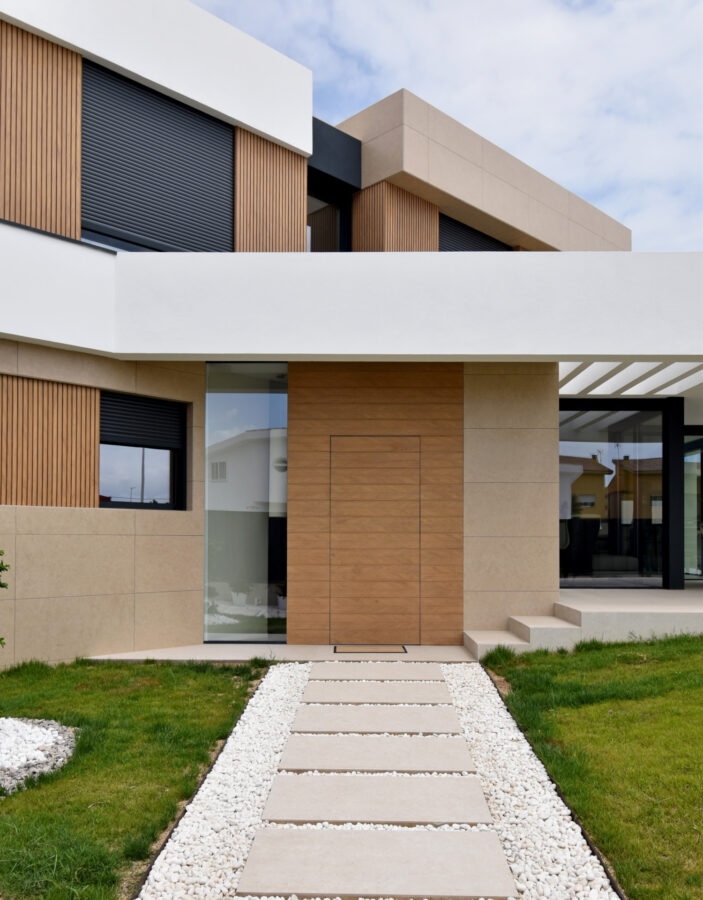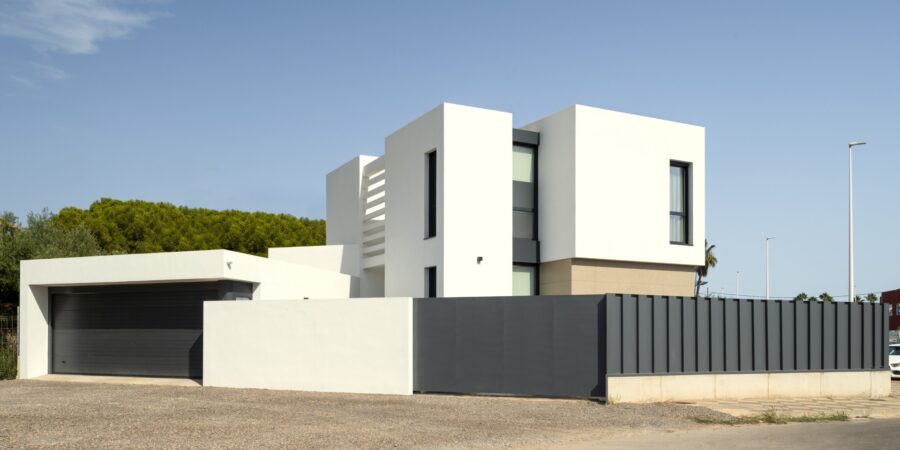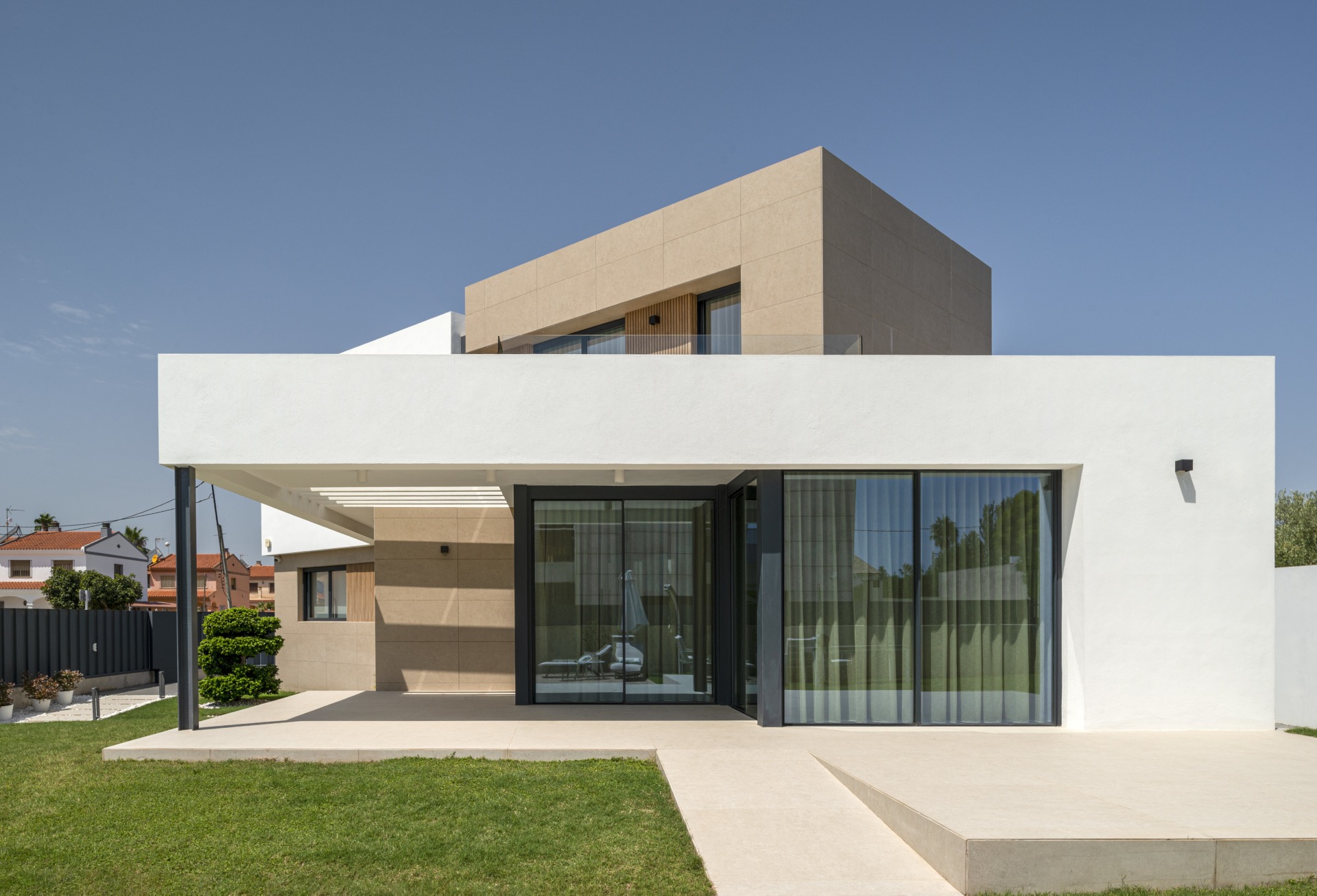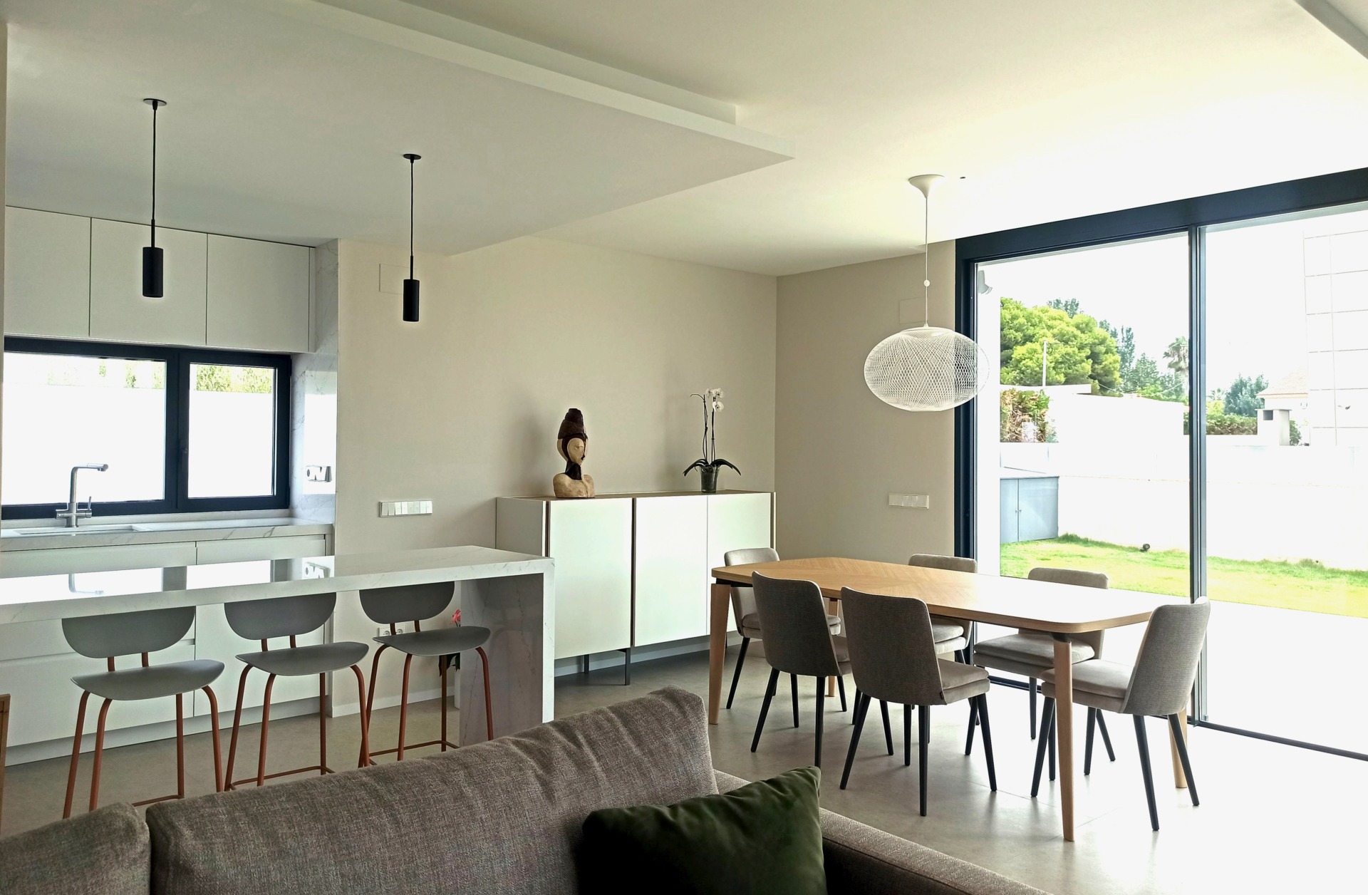 La vivienda se sitúa en una parcela sensiblemente cuadrada y cerca del mar. En la planta baja de este proyecto se ha buscado una forma en L abierta, para orientarse hacia el sur y hacia el espacio libre de parcela.