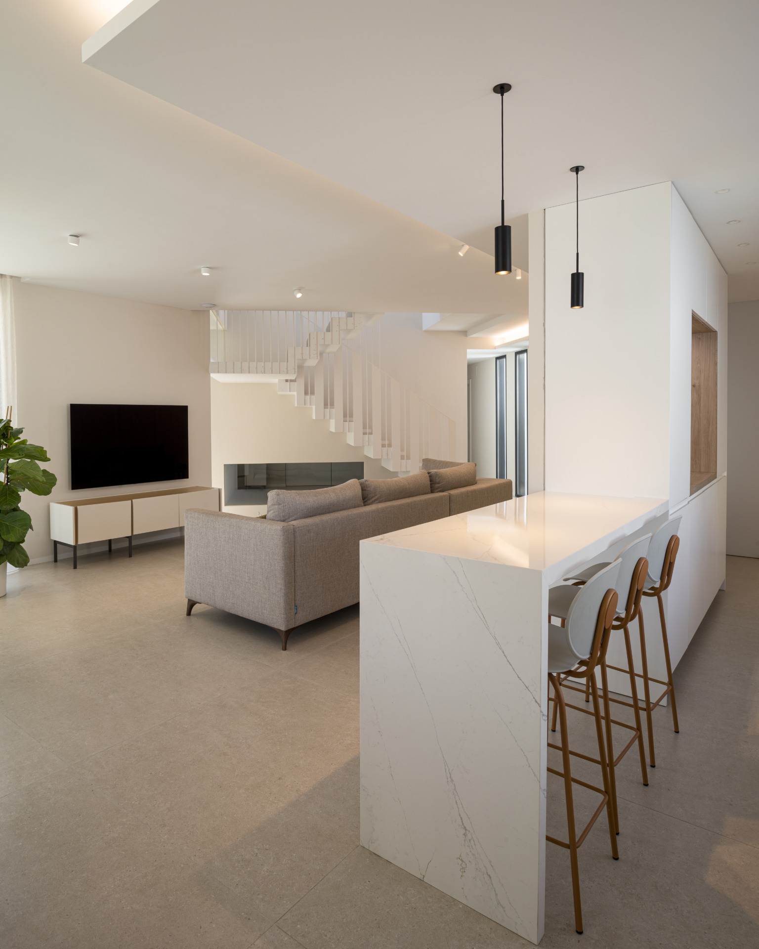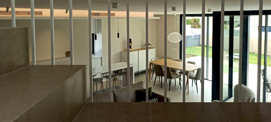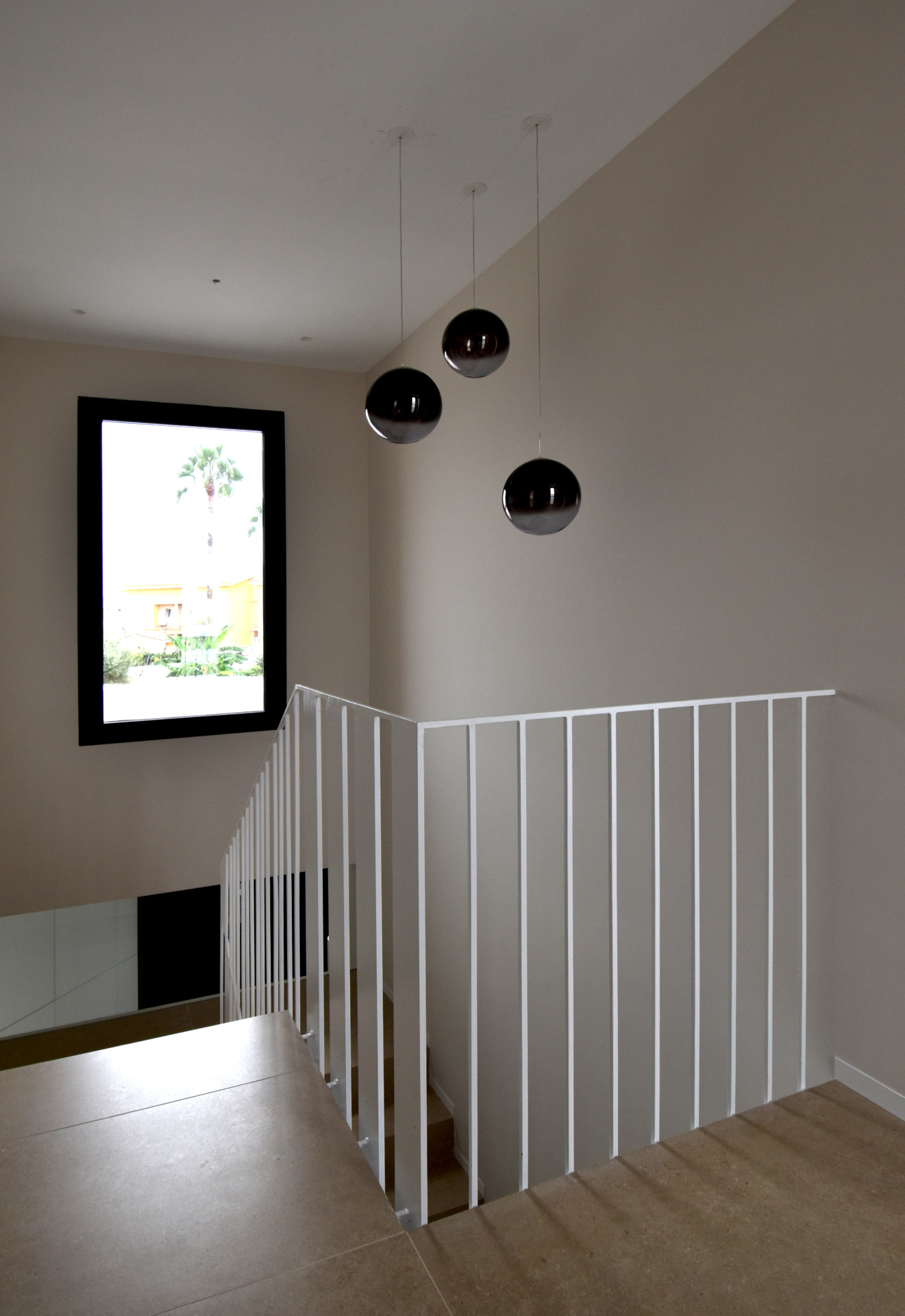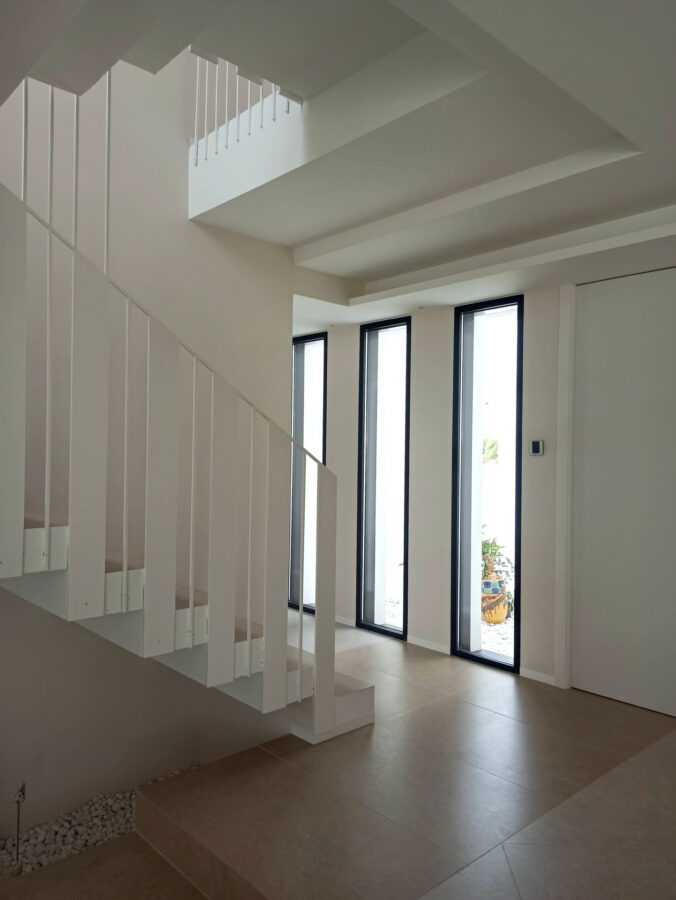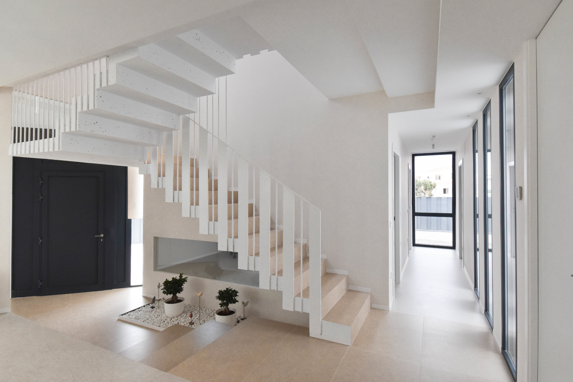 Destaca el hall de entrada a la vivienda, donde aparece la escalera, situada en la rótula de la L. Este espacio genera la conexión visual entre los espacios interiores abiertos y de gran luminosidad, provocados por las grandes aberturas en fachada para la conexión interior-exterior