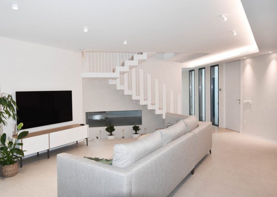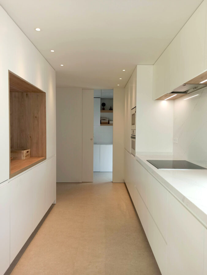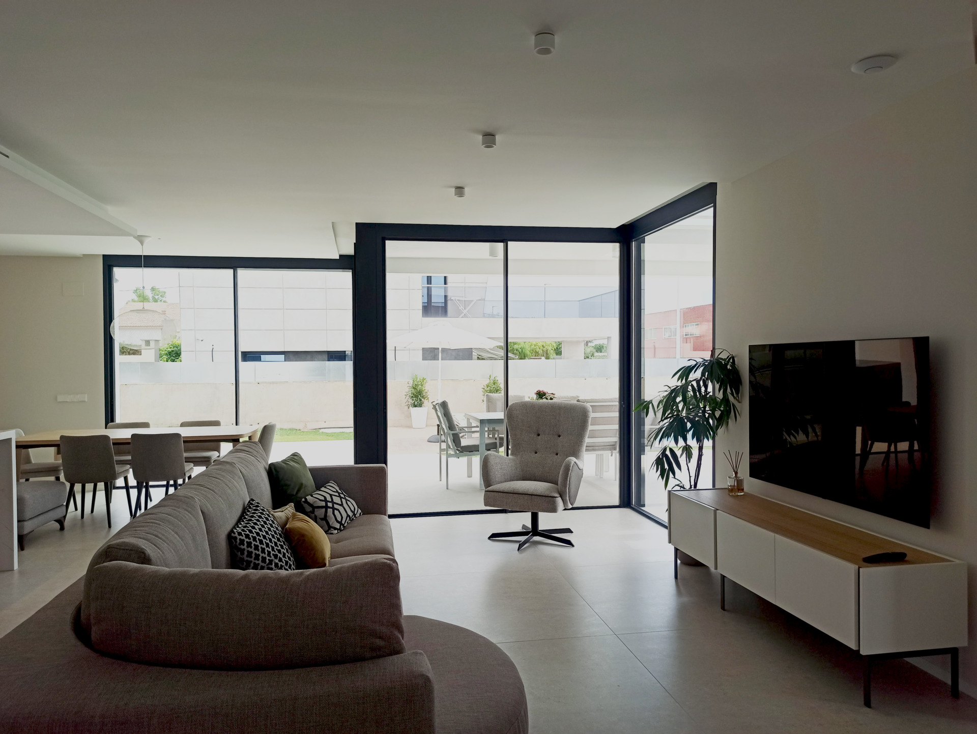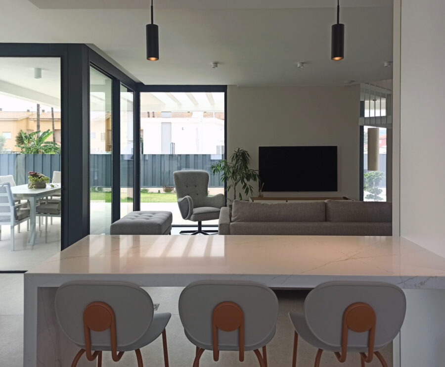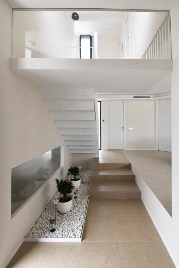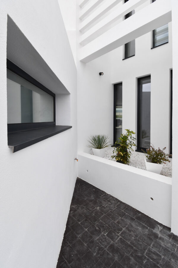 Destaca el hall de entrada a la vivienda, donde aparece la escalera, situada en la rótula de la L. Este espacio genera la conexión visual entre los espacios interiores abiertos y de gran luminosidad, provocados por las grandes aberturas en fachada para la conexión interior-exterior