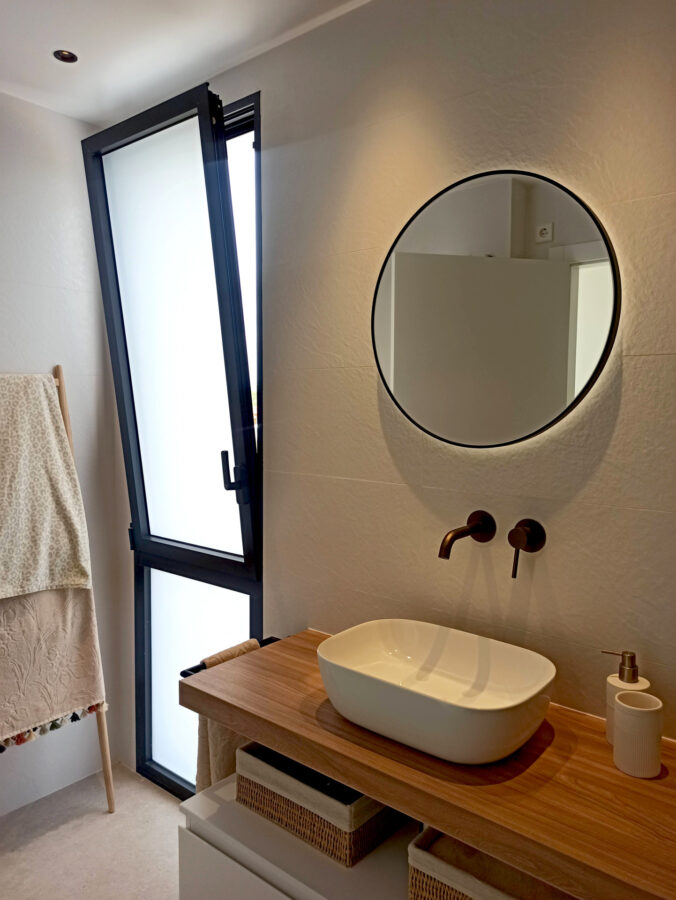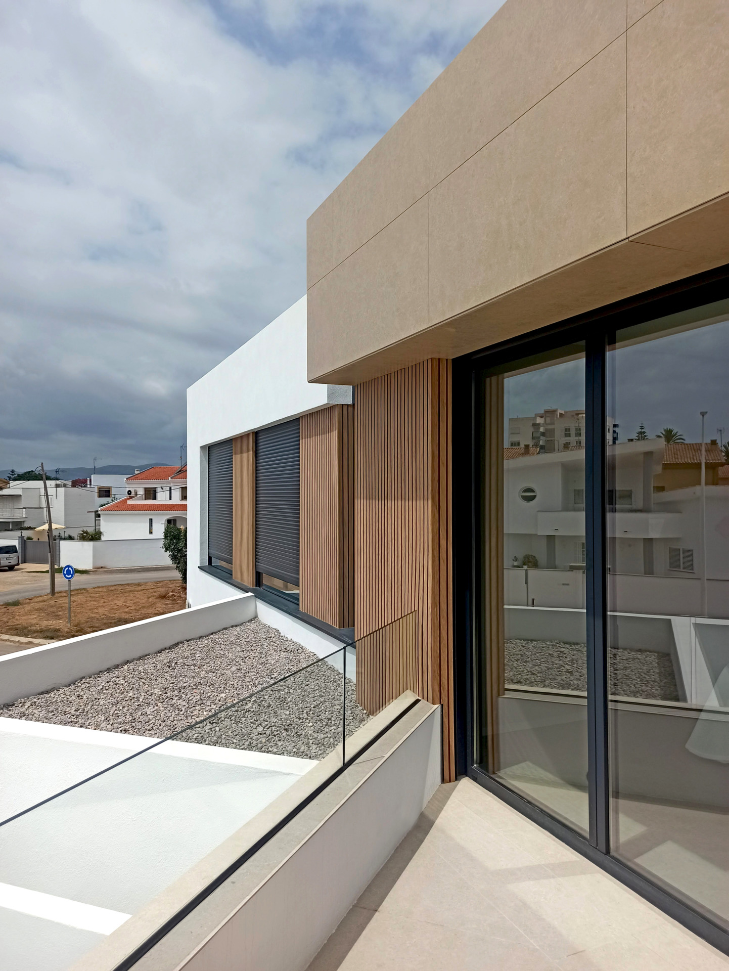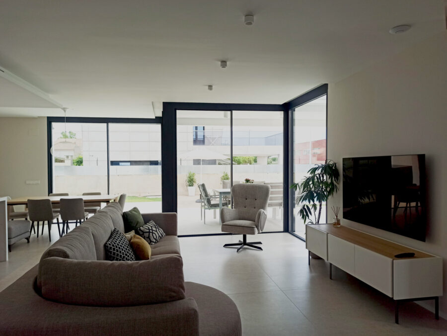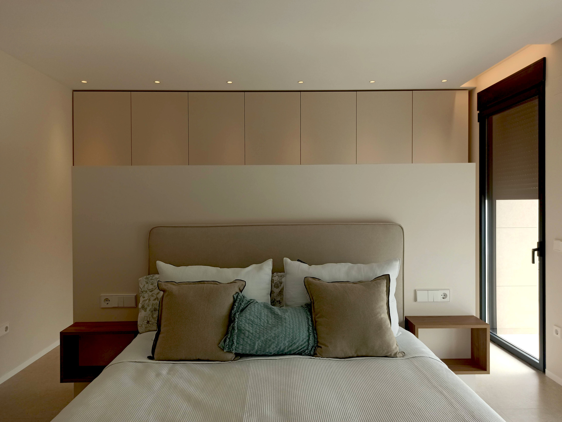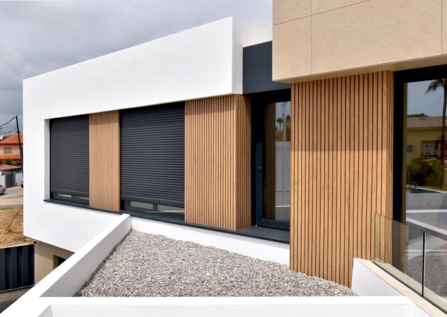 En este espacio se encuentra la piscina y el acceso a la vivienda desde la calle. Por otro lado, la casa se aproxima a los linderos de la parcela en la orientación Noroeste y Noreste, por donde se accede al garaje. Esta planta baja alberga el salón-comedor-cocina con un lavadero, dos habitaciones y un baño completo. La planta superior, donde se sitúa la zona de noche, es de forma rectangular y se prolonga en la dirección de una parte de la L.