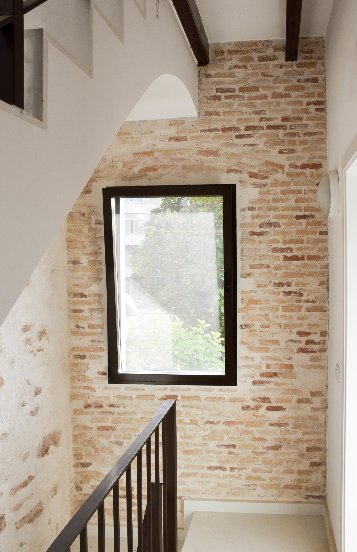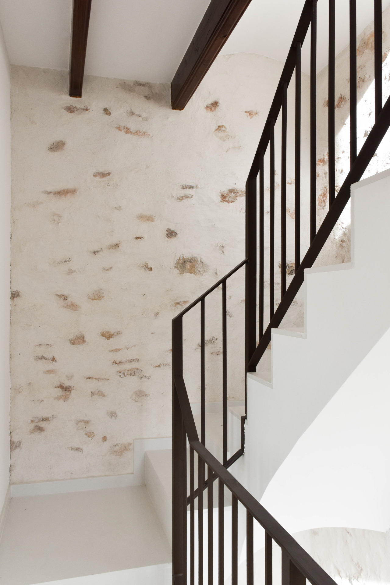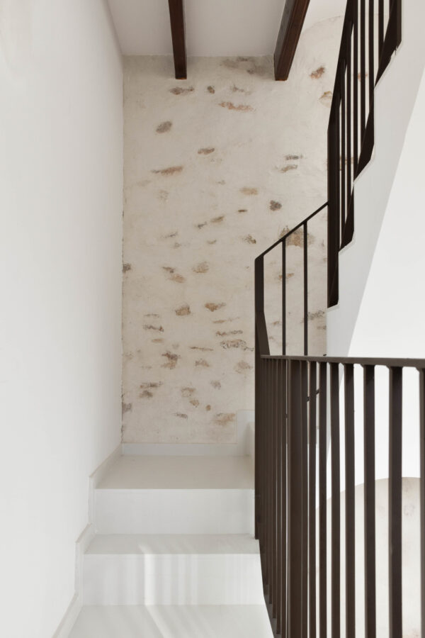 En su interior, la materialidad de la escalera proporciona la espacialidad necesaria para dar continuidad, mientras que, en los techos, las vigas actuales se restauran, resaltando el carácter estructural primitivo. De la misma manera, las paredes desvelan la construcción original, tanto la piedra en la zona de la escalera como el ladrillo en las estancias de la vivienda.