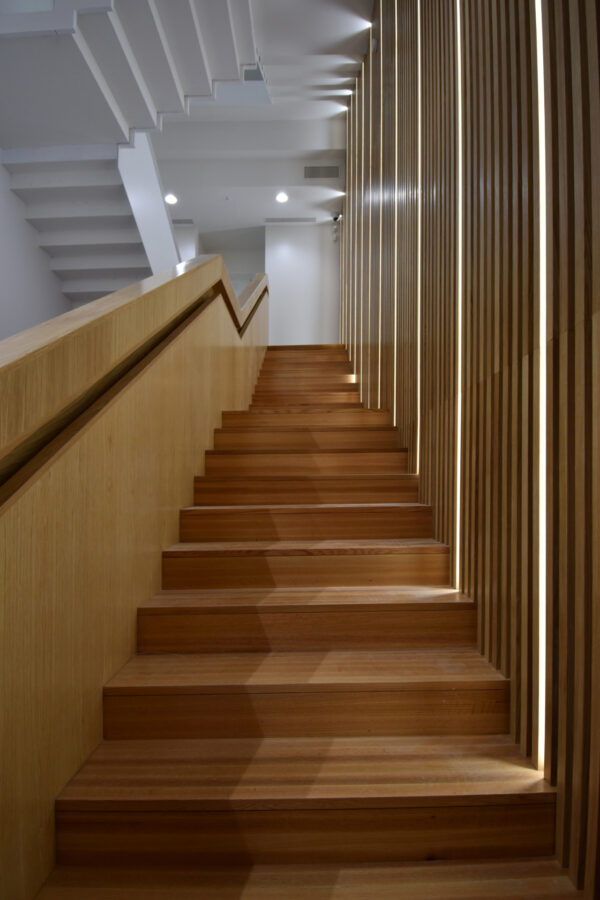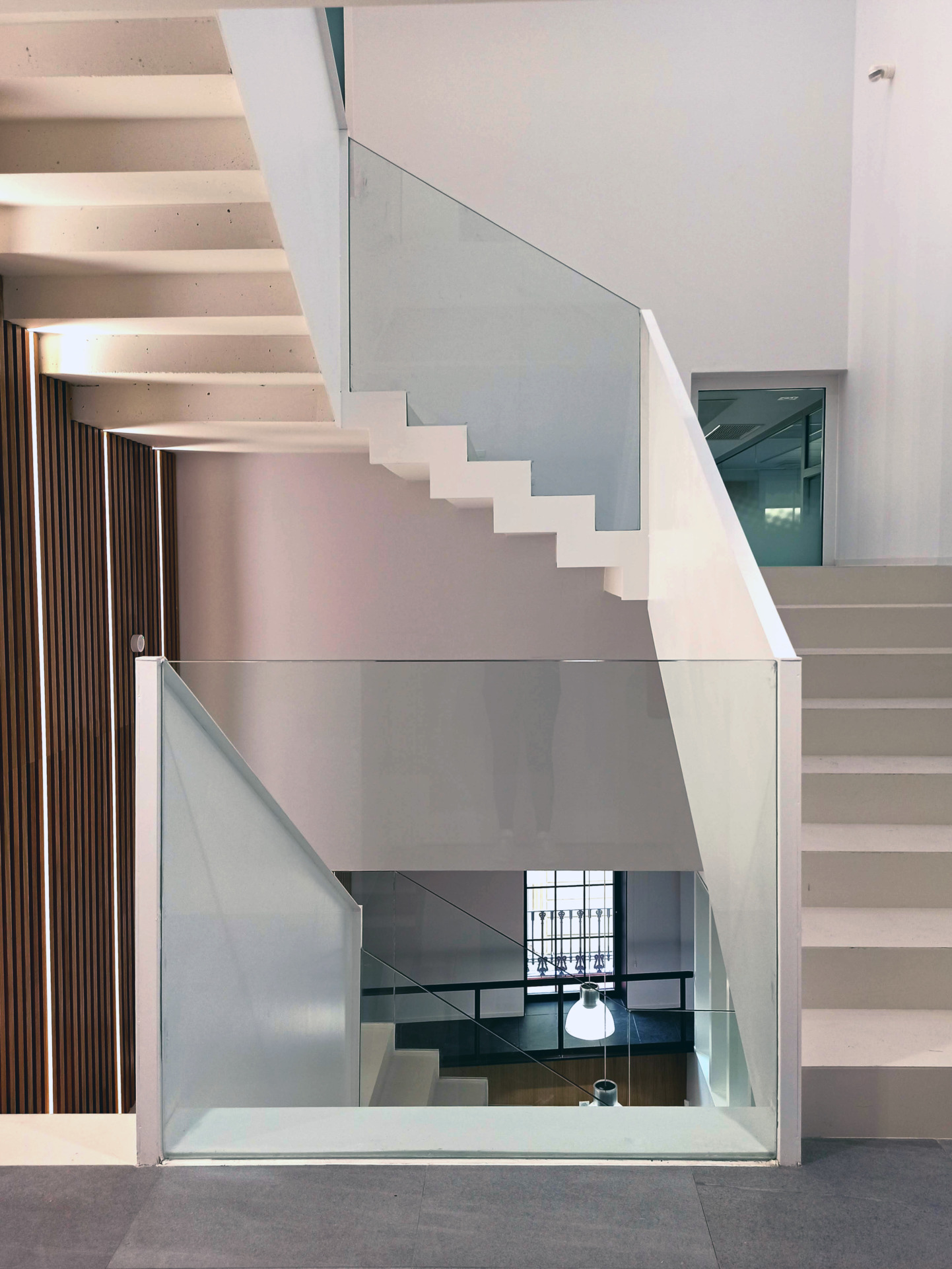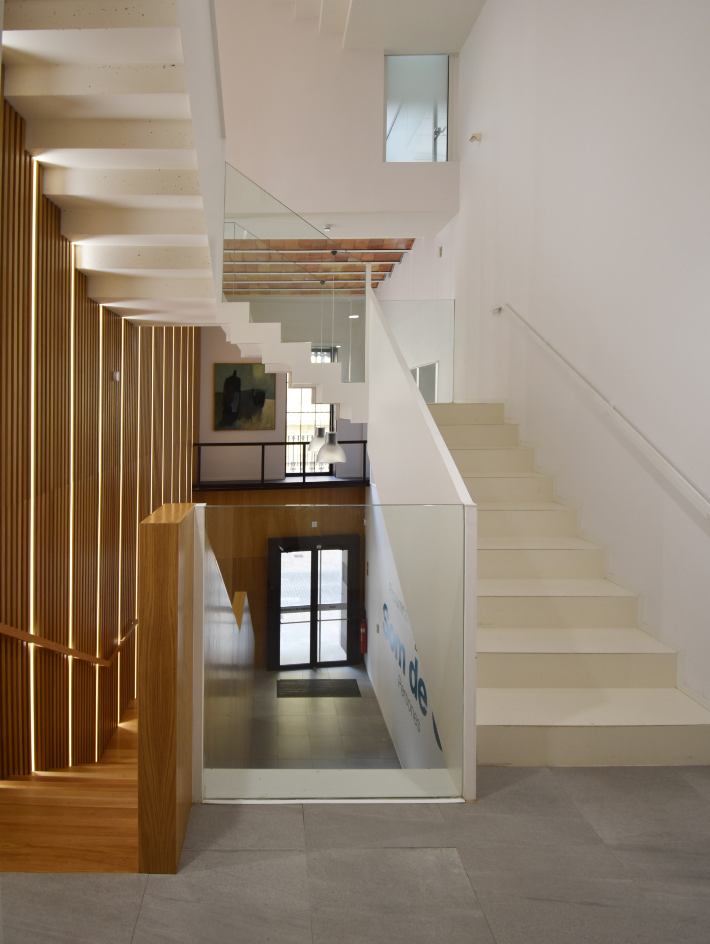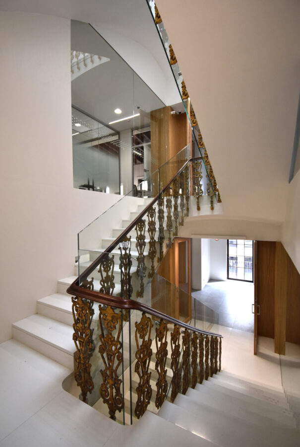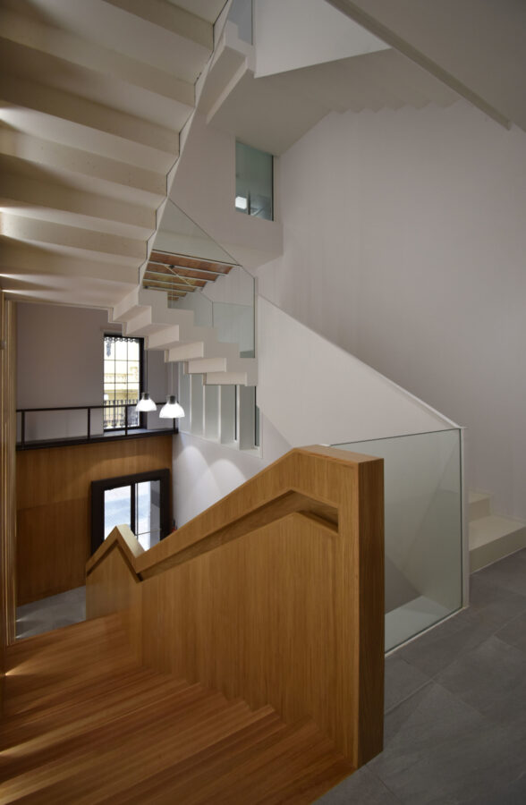 A fin de contener varios usos independientes, como son una oficina bancaria convencional y una dirección territorial, además de áreas de formación y conferencias; se plantea la apertura de un segundo acceso con una escalera independiente, que permite resolver e independizar circulaciones de uso público con las de uso interno del banco. Por otra parte, la escalera original, queda liberada de los muros que la contienen dándole visibilidad, a la vez que provoca una mayor transparencia espacial.