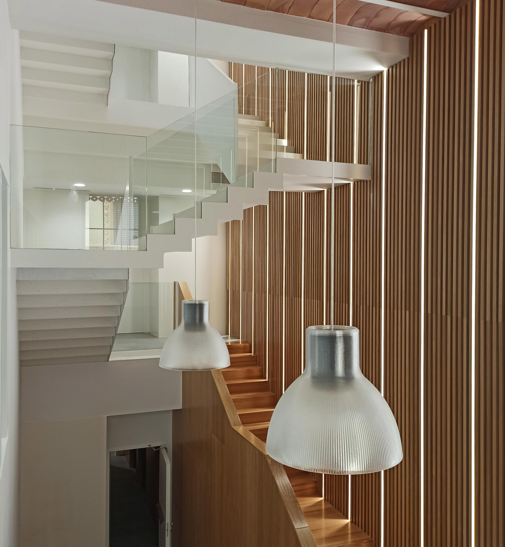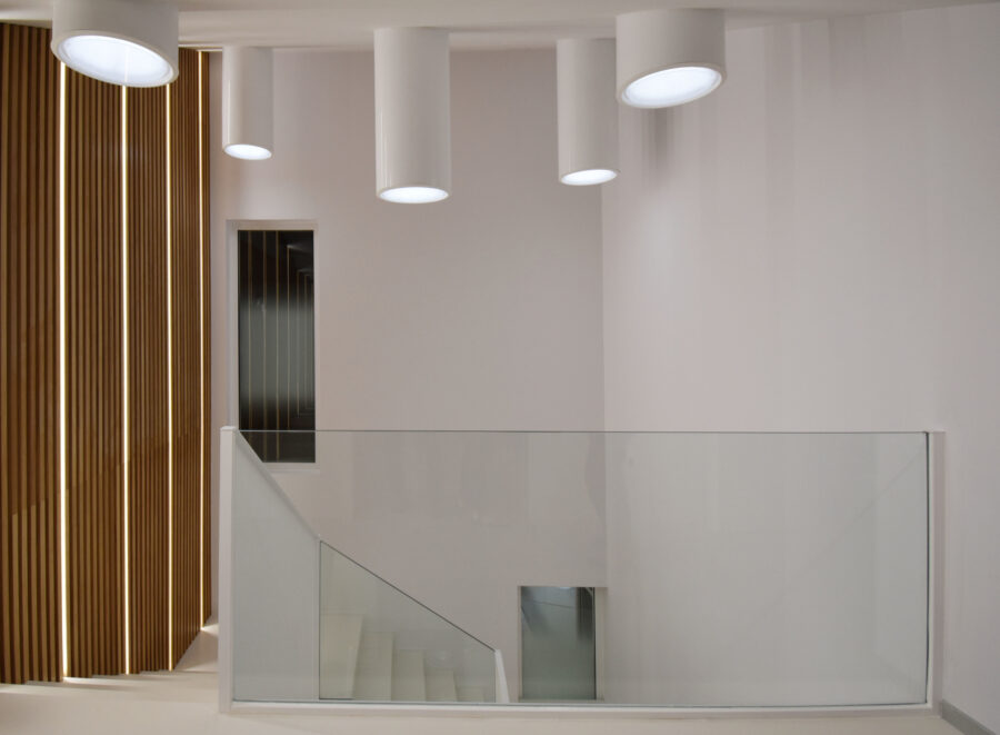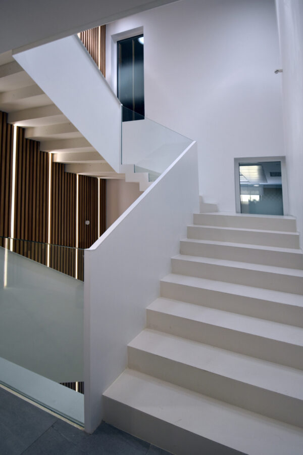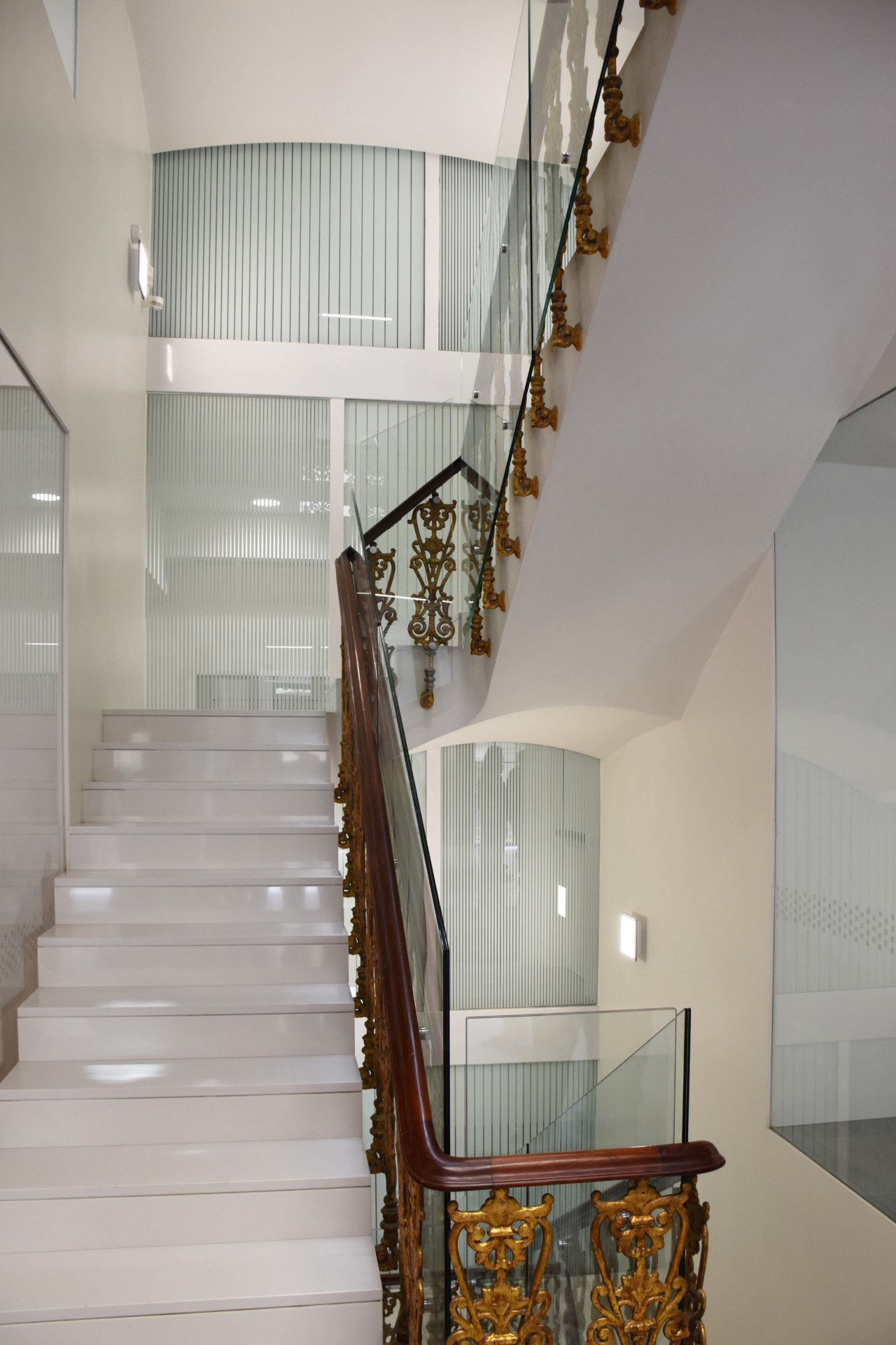 A fin de contener varios usos independientes, como son una oficina bancaria convencional y una dirección territorial, además de áreas de formación y conferencias; se plantea la apertura de un segundo acceso con una escalera independiente, que permite resolver e independizar circulaciones de uso público con las de uso interno del banco. Por otra parte, la escalera original, queda liberada de los muros que la contienen dándole visibilidad, a la vez que provoca una mayor transparencia espacial.
