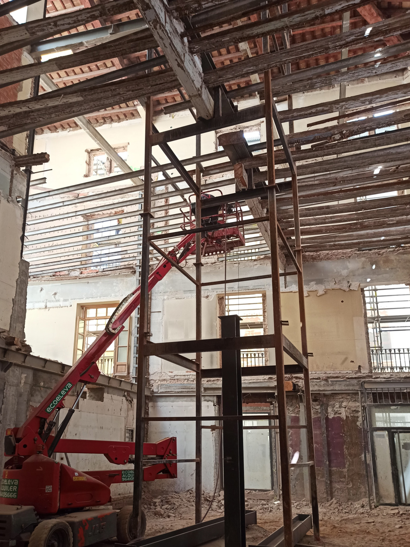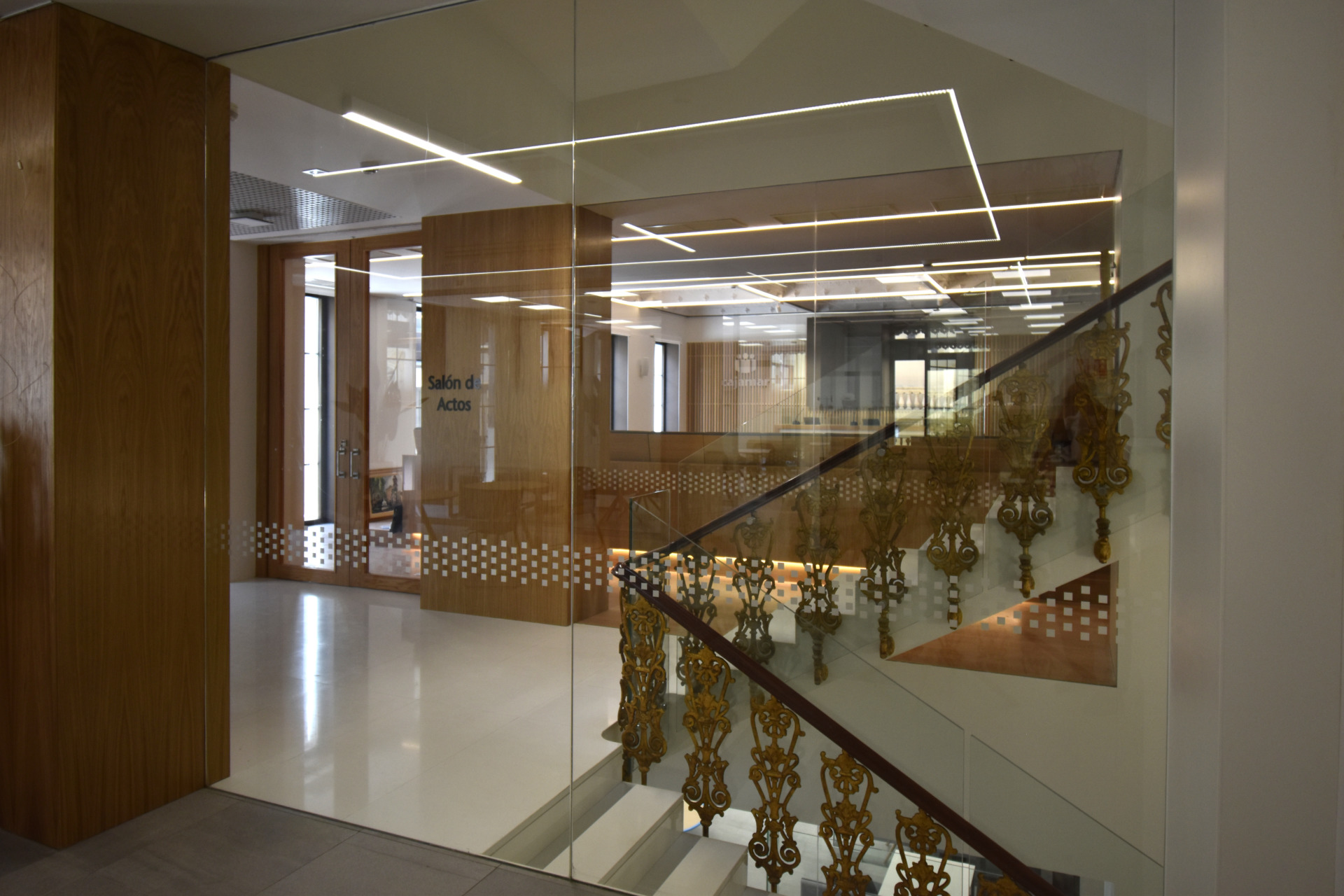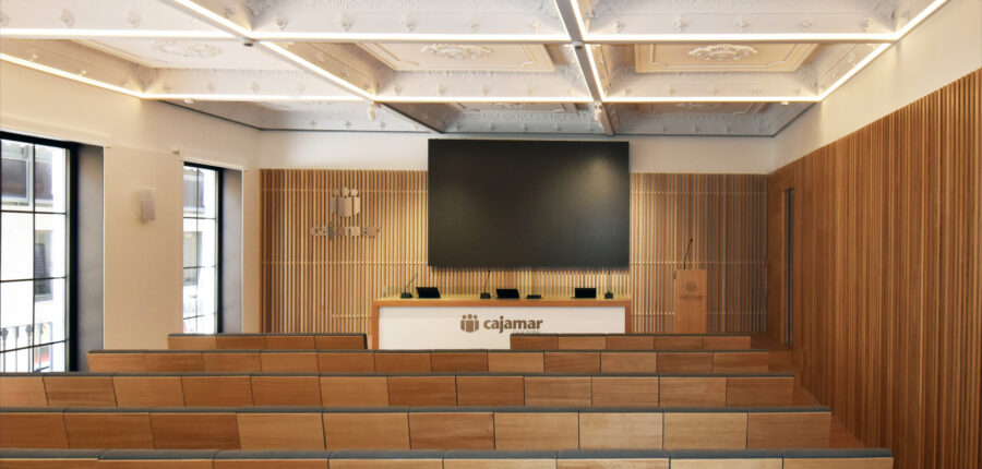 Desnudando los falsos techos de aquellas zonas de mayor relevancia, se resaltan las prexistencias, en especial la estructura de cubiertas y el falso techo del salón de actos.